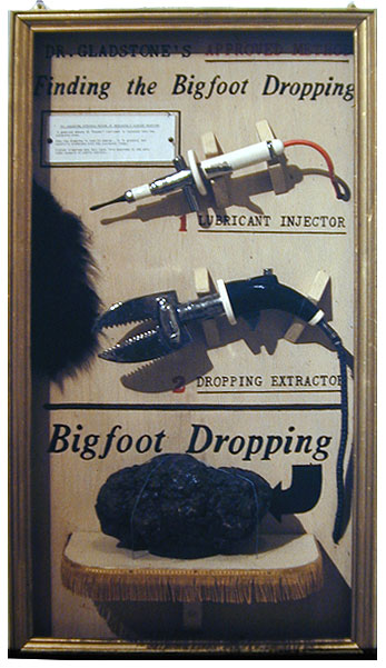 "FINDING THE BIGFOOT DROPPING" - 1974 ceramic, on painted wood, fur, grease 24" X 36" X 12"