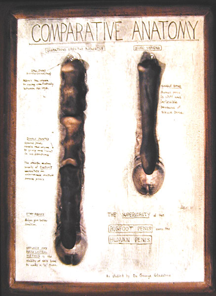 According to press releases issued by Dr. Gladstone, the skeleton represents a race of giant man-like creatures that possess nature's perfect birth control device, the Triple Jointed Penis. Gladstone explains," Human males have a single penile bone; whereas Bigfoot has a triple-jointed bone that can make a "U" turn, and deposit its sperm outside the female." This handy and efficient form of birth control explains the rarity of Bigfoot today. The triple jointed penis also suggests that Bigfoot was able to engage in athletic mating practices without damaging the bone, and this inspired the creature's scientific name, "Giganticus Erectus Robustus ". Analysis of the bones reveals that they are made of thermally metamorphised mud; much like the clay that Bailey uses in his studio. |