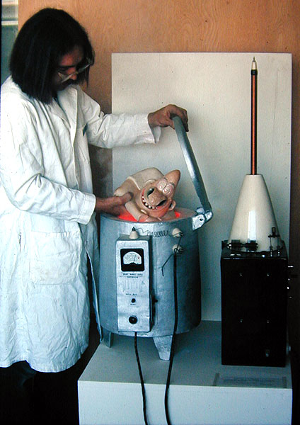 "Pottery to Amateur Science", Bernard Pyron -1974 (Unpublished Manuscript) After the lecture, the audience is invited to examine a copy of Bailey's book: "Bare Hands Raku: the book that shocked the ceramic world" When its metal cover is opened, a shock is delivered to the bare hands of the reader. The Bare Hands Raku apparatus in the Leslie Ceramics collection in Berkeley, features a Tesla coil for high-frequency ignition of the horse manure and has a built-in ozone air freshener. Bailey promises: "It provides all the fun of traditional raku, without the usual smells and discomforts, and it can be used in your living room."