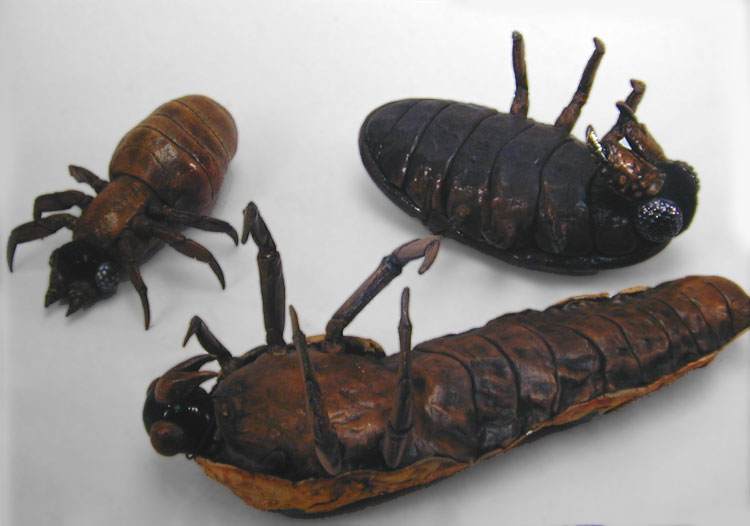 THREE BEETLES - 1977 Ceramic, luster, felt flocking, animal hair 10" to 24" long