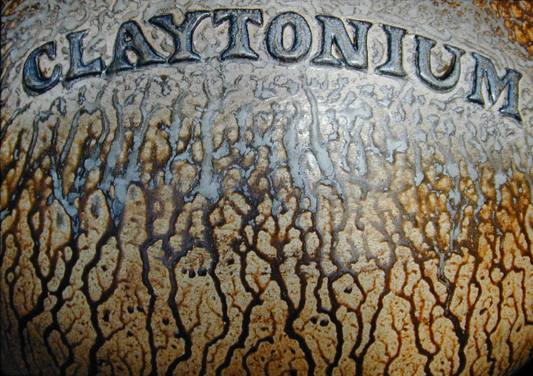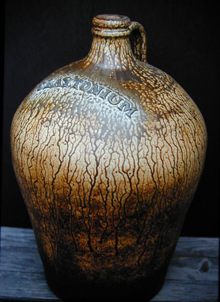 The Tobacco Spit pottery of Clayton Bailey was made between 1987-1998. Tobacco spit glaze originated long ago among American folk potters. When the glaze is fired, it runs down the sides of the pot in golden brown rivulets that earn the glaze its name. Baileys jugs were inspired by traditional salt glazed American pottery. The jugs are beautifully formed, and often outlandish in scale; (some are thirty to fifty gallons in size.) They are labeled as containing Mustache Oil, Unobtainium, Claytonium, or Snake Oil. |