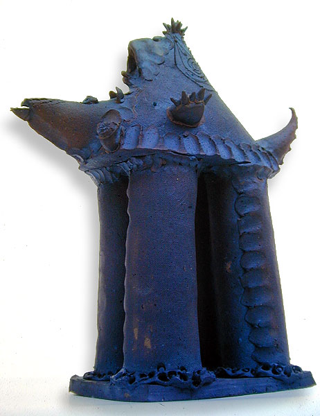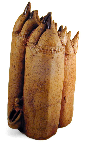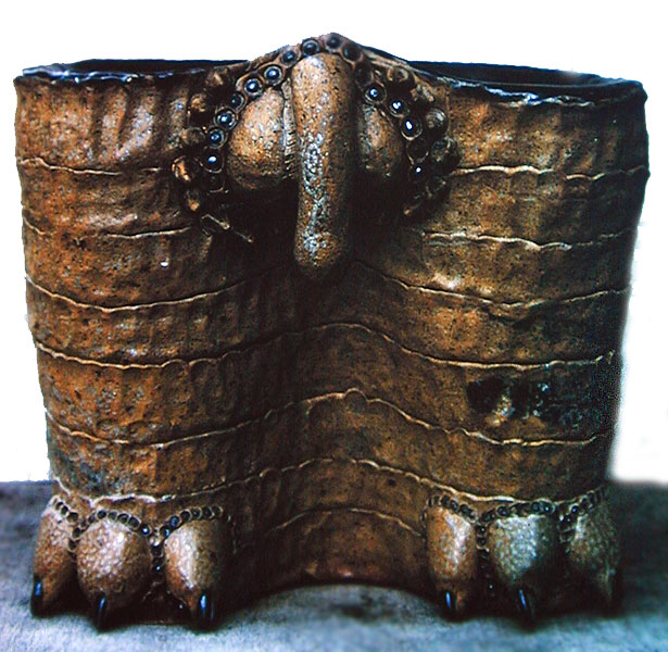 After he had deliberately made a few of these "flopped pots", he came upon the idea of nose ware; a ceramic vessel or pot with a prominent nose, beady eyes and puckered lips. The first true Critter was simply a nose tea pot with legs; thus creating a place to attach breasts and genitalia. Bailey says the Critters were inspired by prehistoric Japanese Haniwa figures and by Mad Magazine cartoons. Critters have either two legs or four legs . With their stiff, straight legs, they are static and ritualistic in appearance. The Critter series evolved into "Dead Critters" which represent an animal flipped on its back, with legs and toes straight up in the air, like a stylized cartoon representation of a dead animal. The bottoms of the feet become the most prominent feature of the Dead Critters, but a nose and lips are clearly seen peering from beneath the body.