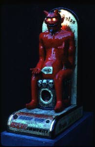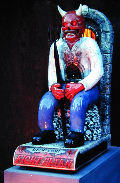 Many people are truly bothered by Satanic temptation or by demonic possession. "The Devil made me do it.", is an excuse frequently offered by the criminal. FIGHT CRIME While reading a religious tract, Reverend Clayton Bailey developed the concept of fighting crime through "Psychic Immunization". According to his theory, psychologically "charged" sculptural forms and symbols create an "immune response" in the viewer. They stimulate the production of psychic antibodies in the mind, thus protecting the viewer from further possession or temptation by Satan. "Fight Satan" is a coin-operated source of psychic immunity. When you insert a coin, it shows a scene of burning Bibles, and emits demonic laughter and blood curdling screams. Thus the viewer is given a "psychic inoculation". The psycho-immune response is believed to be greater when you pay for the experience. The more money you put into the coin slot, the more effective the treatment. Jenner's inoculation with weakened smallpox virus caused the recipient to create antibodies against more serious infection by the disease. Religious and satanic symbols entering the eyes protect the viewer against invasion by Satan in the same way as a conventional inoculation. |