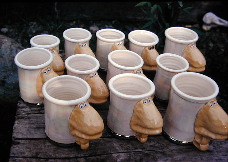 (Showing the evolution of the Nose Teapot) The Nose Teapots are crude teapots with large nose shaped spouts, beady eyes and puckered lips.They can pour two cups of tea at one time; one cup is filled from each nostril.