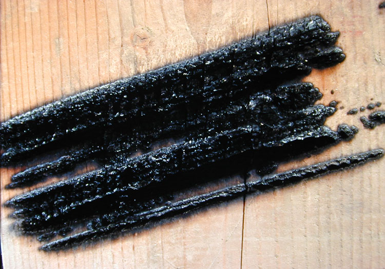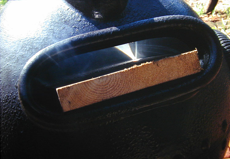 One sunny afternoon, as he reached into the jug to wipe off the lens, he accidently burned his hand in the focused rays of the sun. Next, he poked a 2 x 4 board into the jug, and when it immediately burst into flame, Bailey realized that he had discovered a powerful solar death ray gun machine. From this accident, was born the idea of the Pyrosphere in 1992. The Pyrosphere is a solar data gathering instrument which records sunlight as a burned line in a 2" X 12" board. (See below)