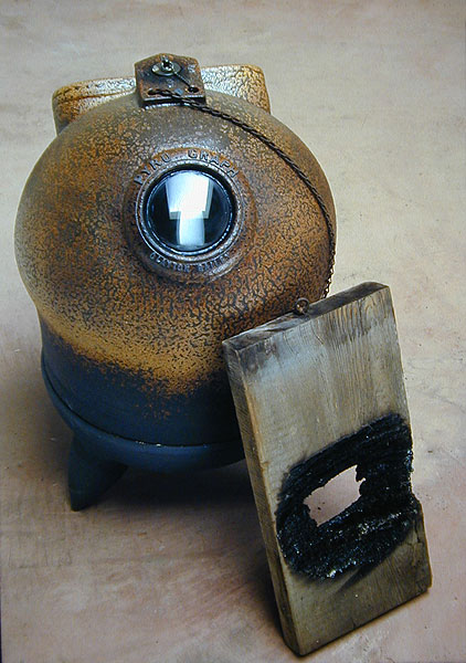 Solar Pyrosphere- 1992 Stoneware ceramic with glass lens 2" X 12" wood plank 30" diameter