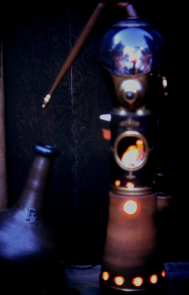 "Souffler's Furnace" - 1987 Ht. 60" A pseudo-distillation apparatus made of ceramic stoneware, porcelain, steel, copper, brass, glass and high-voltage electricity. |