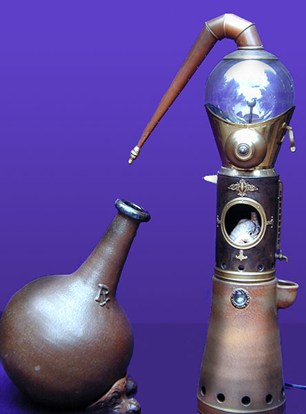 Souffler's Furnace shown here in the dark. By some miracle of alchemy, it contains real lightning bolts within its glass dome, and inside its belly; is a furnace with a glowing porcelain embryo "incubus" floating above a small simulated fire. Resembles distillation apparatus that might have come from an alchemist's lab in one of Brueghel's drawings. |