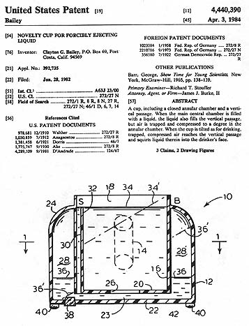 unique or original twist. SQUIRT TRICK CUPS Bailey read about a "Spitting Frog in a Cup" in a 19th Century book about magical apparatus. Unable to locate any further information about such a cup, Bailey decided to design a "Spitting Cup" himself. For three years, he tried dozens of experimental designs by trial and error until in 1981, he found one that worked. The Squirt Cup spews liquid into the drinker's face when it is tilted because air pressure is created within the double walls of the cup when it is filled. Tilting the cup disturbs the equilibrium, and a pressurized bubble of air escapes, forcing liquid into the victim's face. In 1984, U.S. Patent #4440390 was granted for a Novelty Cup for Forcibly Ejecting Liquid Into The Drinker's Face. Several prototypes with different designs were made. The Old Faithful cup pictures a geyser. Another says, "California Springwater". When the Hazardous Waste Jar was demonstrated for the Cal-OSHA inspector at the State University, it squirted water three feet into the safety inspector's face. THIEF TRICK CUP The Thief Cup, made in 1979, is also a double-walled container. The black glaze conceals a narrow slit located at the high water level of the cup. This slit allows the drink to flow into a hidden chamber between the double walls of the cup so that it never reaches the drinker's lips. As the cup is tilted, the drink comes tantalizingly close to the lips, but soon the cup is empty, and not a drop has been swallowed.